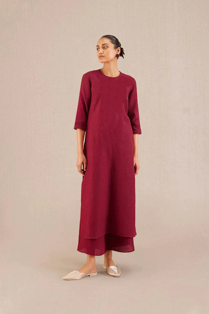 This rich reddish maroon kurta set combines comfort and style, perfect for loungewear or casual outings. Made from breathable cotton linen, this shirt and pants set is loved by celebrities for its effortless look and feel.